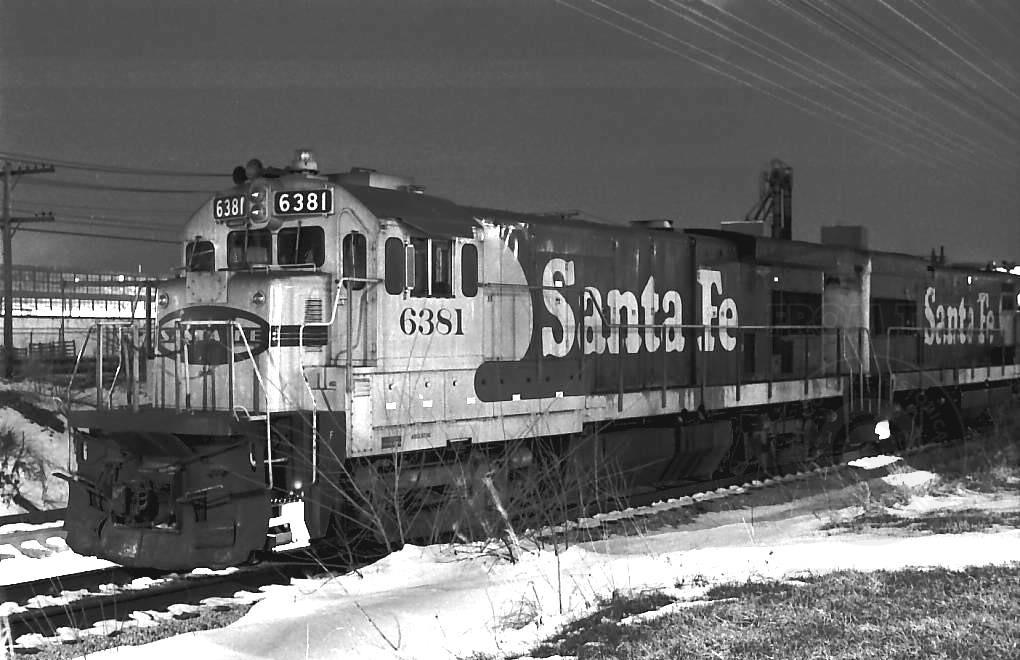 Conrail WSAN 44 with a pair of Santa Fe GE's, including ATSF 6381, rests on the Red Key just East of Goodman Yards in Marion, IN on April 8, 1982. Kevin Nelson photo with permission