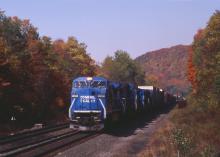 C40-8W 6140 with SEFR at Ballou's in Washington, MA. The concrete base for former automatic block signal 134.72 is to the left.