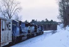 SD60M 5553 has the trail as NESE is about to duck beneath the now-extinct Bullard's Crossing truss bridge.