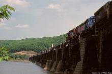 CR SD-35 6016, BAR GP-38 87, GP-35 3633 (ex-RDG), and an SD-45 cross Rockville Bridge with a load of hoppers in May, 1977.