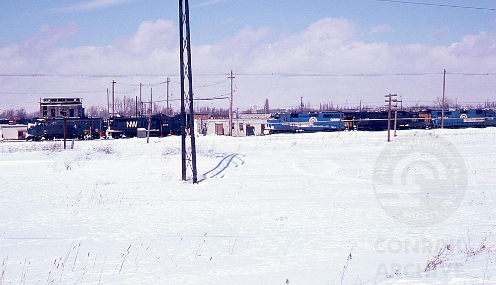 The West end of the Southern Tier was at Bison Yard, a joint facility with N&W. It did not take long for this yard to be abandoned, since Frontier Yard was only a little over a mile away. Here is a mix of power at the engine facilities as seen from the old LV main.
