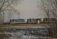 Previous Next Photo By Alan Page A trio of Boston & Maine units, GP-18 1754 and GP-9's 1715 and 1721 at Selkirk yard in December, 1977. Year 1977 Original Date 12/26/77 Location Selkirk NY Location Details Selkirk yard Additional Galleries Alan Page's CR: 5-1977 to 4-1978 Subject(s) Foreign Power on Conrail Collection CRHS Conrail Photo Archive Contributions
