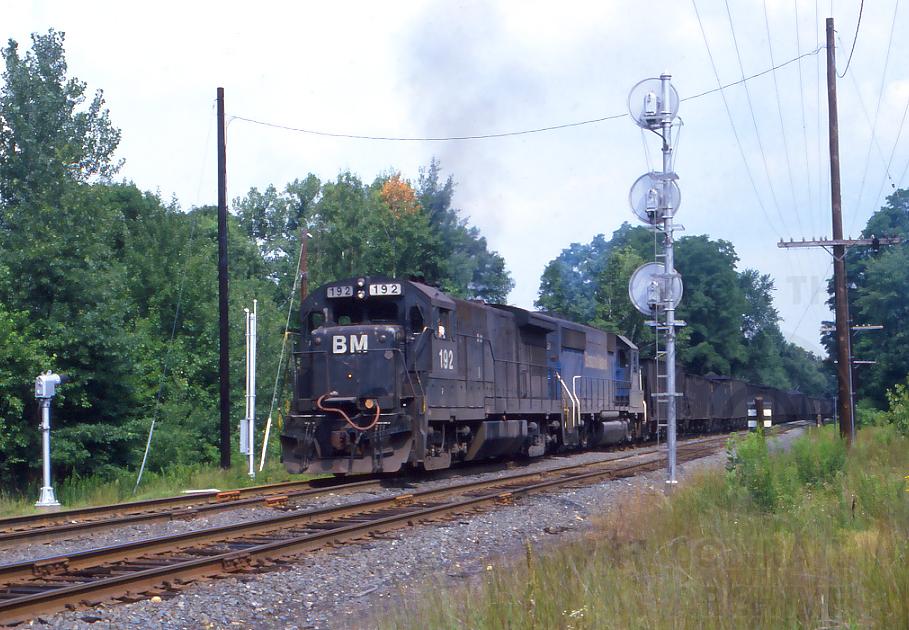 U33B 192, ex CR 2925, leads a Mt. Tom coal train, symboled as SP-1, southward on the Conn River line at Deerfield interlocking on Aug. 3, 1984.