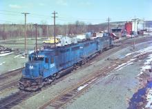 A light engine move at East Deerfield yard on March 31, 1984 contains two consecutively numbered ex ConRail GP40's, the 3234/BM324 and 3235/BM325.