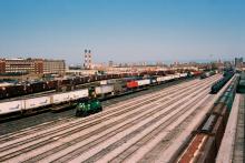 BN SW1000 No. 441 visits Conrail's Ashland Avenue Yard in a view looking east from the Damen Avenue bridge in April 1986. Look at all those Conrail Trailvan trailers in the background. Doug Davidson photo with permission