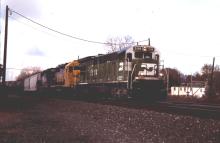 BN 5114, ATSF 2917 - a GP35(!), and CR 3366 powers SFEL-8 off the Porter Branch and onto the Chicago line at Porter, IN on November 8, 1997.