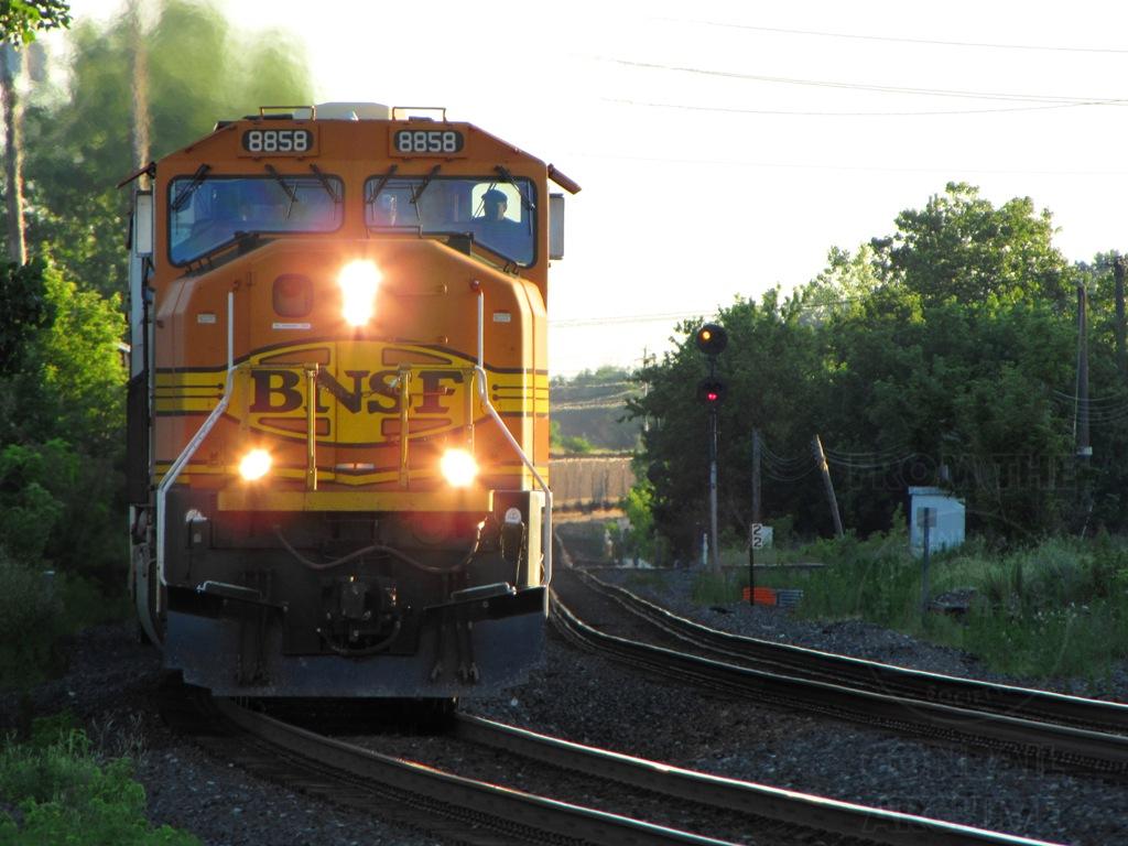 The daylight slowly fades into an orange glow and the shadows become longer as BNSF SD70MAC 8858 leads an N800 series CSX unit coal drag through Berea. This particular train originated in the Powder River Basin and is destined for Cleveland Electric Illuminating Company's Eastlake, OH coal plant. The train consists of FEPX and CEFX Trinity all aluminum 5-bay hoppers, arguably one of the smoothest and quietest unit train consists to ride on welded rail. Time: 8:18pm