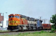 Conrail ELIN-8A with brand new BNSF 9842, 9692, and CR 6134 heads south at MP 81 on the Marion Branch bound for Indianapolis on May 28, 1998. This was a very rare occurence as the Marion Branch in its later years did not see very much foreign power on the point of its trains. Kevin Nelson photo with permission
