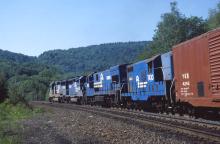 Going away shot of SPSE's headend for a better look at the rare birds in trail position. U23C's saw several months of duty on the Boston Line in road service. The 7430 is a GP9, but spotting features are inconsistent.