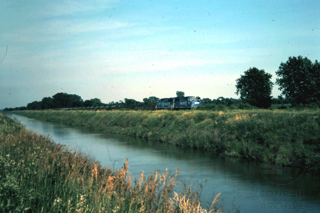 BUHE-9X is heading westbound on the Kankakee Secondary at State Line, IN on July 19, 1997