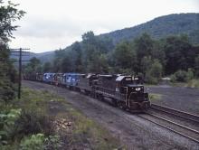 Westbound ballast train BLR173 grinds through Bancroft, MA. at 18:06 on July 3, 1981. As I noted on the description page with these 6x7 transparencies, these 5 GP38-/2's and lone B23-7...."engs working VERY hard!"