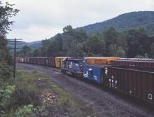 Pusher 6386 shoving against N7B 21056 on the rear of BLR173 at Bancroft, MA. as SENH continues his descent.