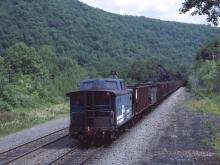 Another ex Pennsy cabin car, N5C 23077, tagging along behind BWF774's string of varied empty hoppers.