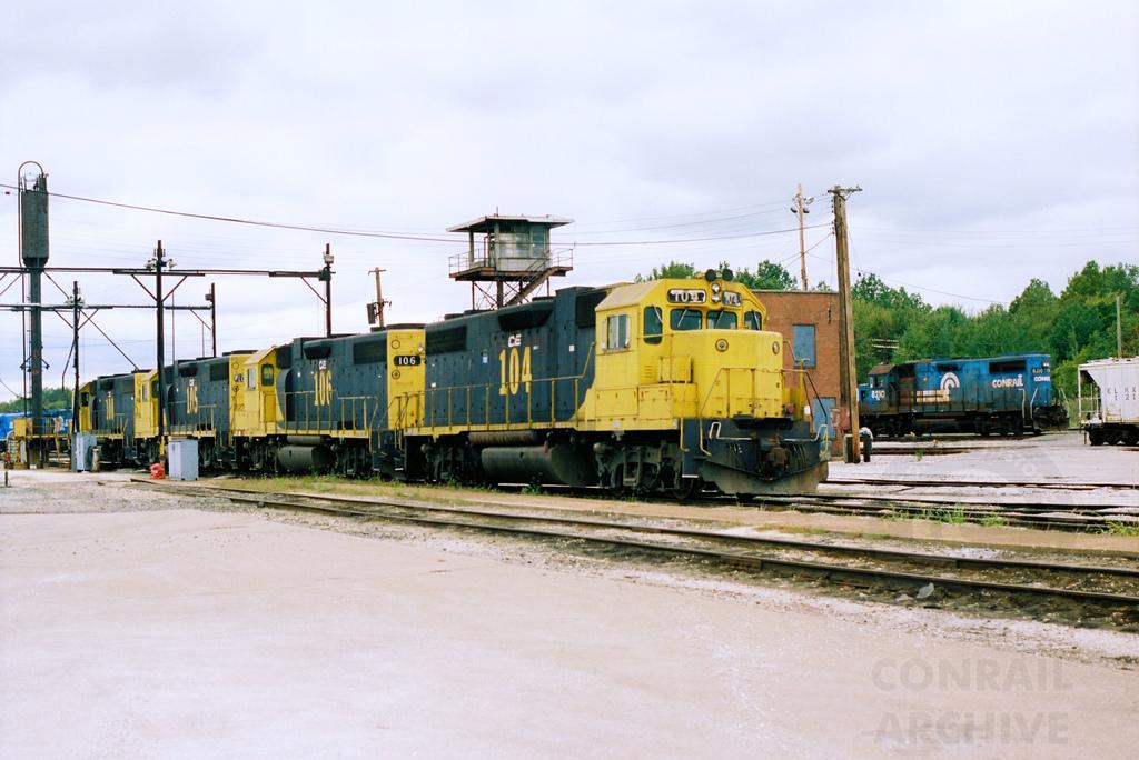 Cleveland Electric Illuminating GP38-2s 104, 106, 105, and 100 fill the service track in Conrail's Ashtabula Yard on Oct. 4, 1994. Doug Davidson photo with permission
