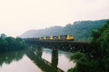 A westbound Conrail coal train behind a quartet of Cleveland Electric GP38-2s(CEICO 103, 105, 101, 104) crosses the Beaver River in Beaver Falls, PA in August 1995. Doug Davidson photo with permission