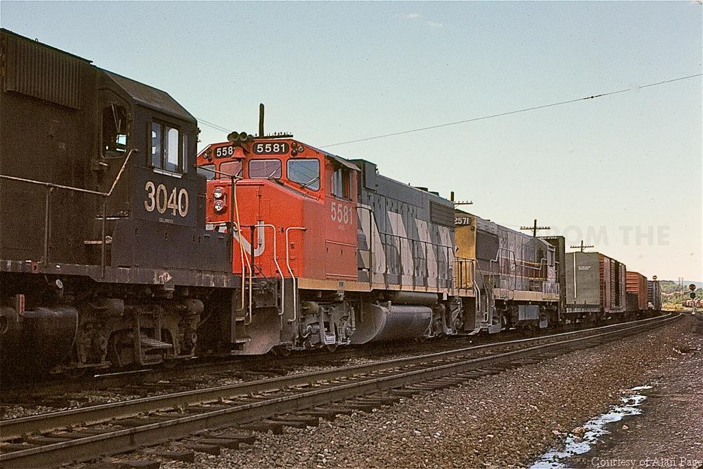 Former PC GP40 3040 leads leased CN GP38-2 5581 and CR U25B 2571 (ex-EL 2502) by the Juniata shops deadline on their way to Conway in August, 1977. The next day at the Conway engine terminal, both CN 5581 and U25B 2571 were mixed with other CR power, ready for another assignment.