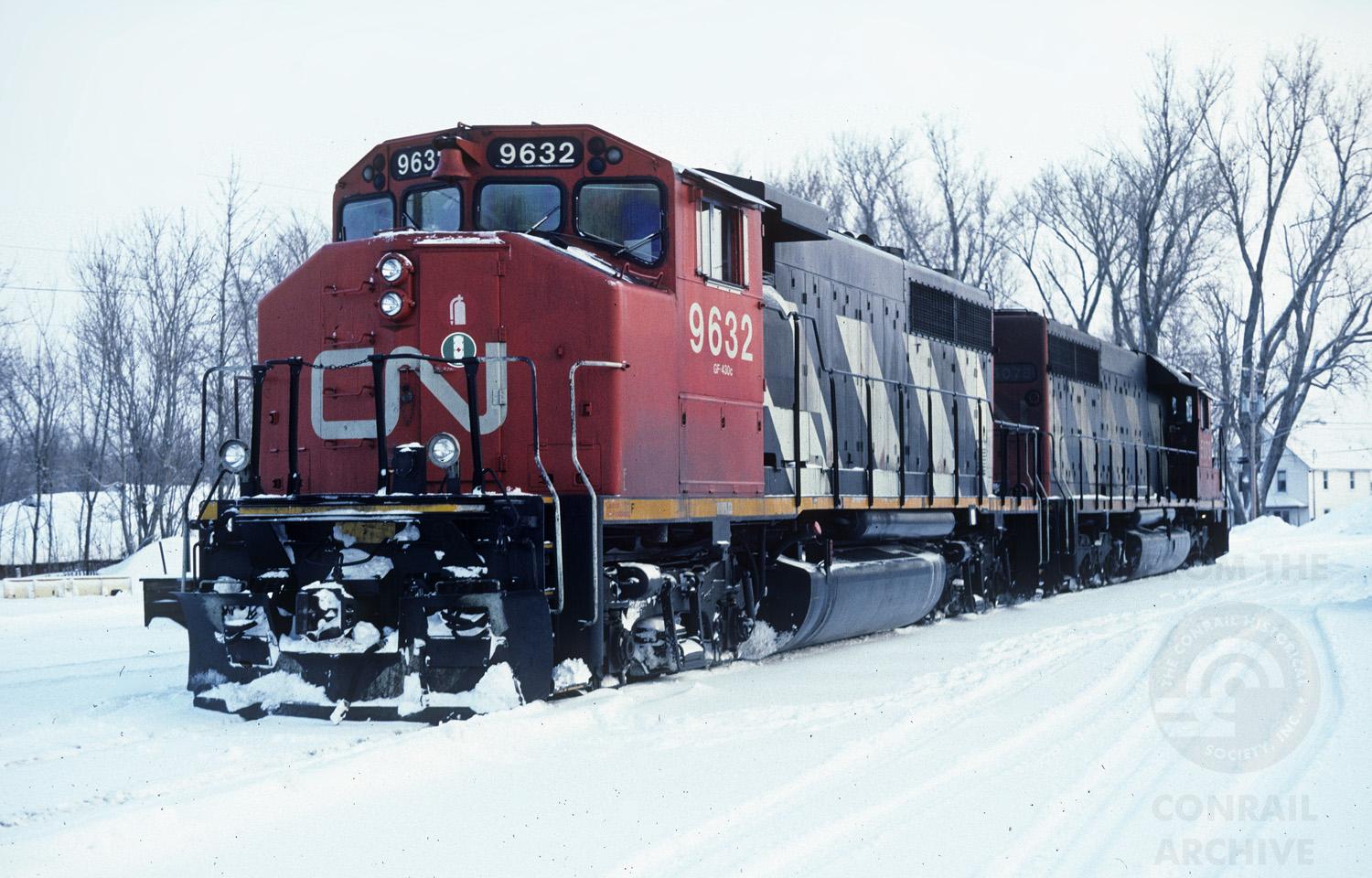 CN 9632 and 5078 idle at Conrail's Massena, NY yard on 2/16/94