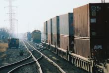 Doug titled this photo "It's a stack attack!!" We are at 22nd Street on Conrails CJ No. 2 Main and this shot is typical of the railroad action in the Windy City. In the foreground is the hind end of a westbound Conrail stack train waiting for entrance into Union Pacifics Global One facility. UP light power returning from Ashland Avenue Yard and another Conrail stack train wait patiently behind. The BNSF Lumber Street Lead is the track to the left of Conrails No. 2 Main and it appears that it will get some attention today from the BN maintenance truck. All this takes place in November 1998. Doug Davidson photo with permission