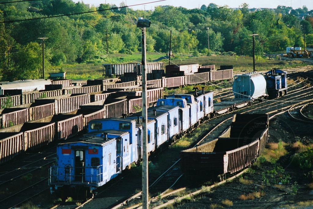 Conrail cabooses line a track in the yard at Altoona on the morning of September 30, 1994. While no numbers are visible, it appears there are several ex NYC bay window cabooses, a few ex PRR ones, and at least one ex RDG wide vision caboose in the storage line. Doug Davidson photo with permission
