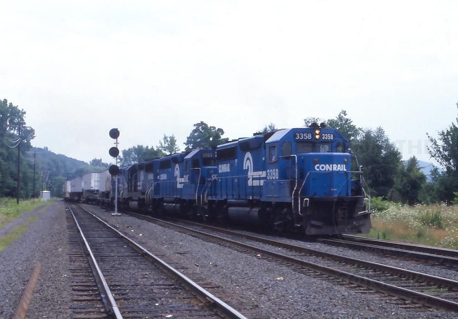 ConRail TV9 "hangs a left turn" at Greenfield East Interlocking in Greenfield, MA., turning off the Conn River line and onto the Fitchburg/Hoosac tunnel route on Aug. 3, 1984.