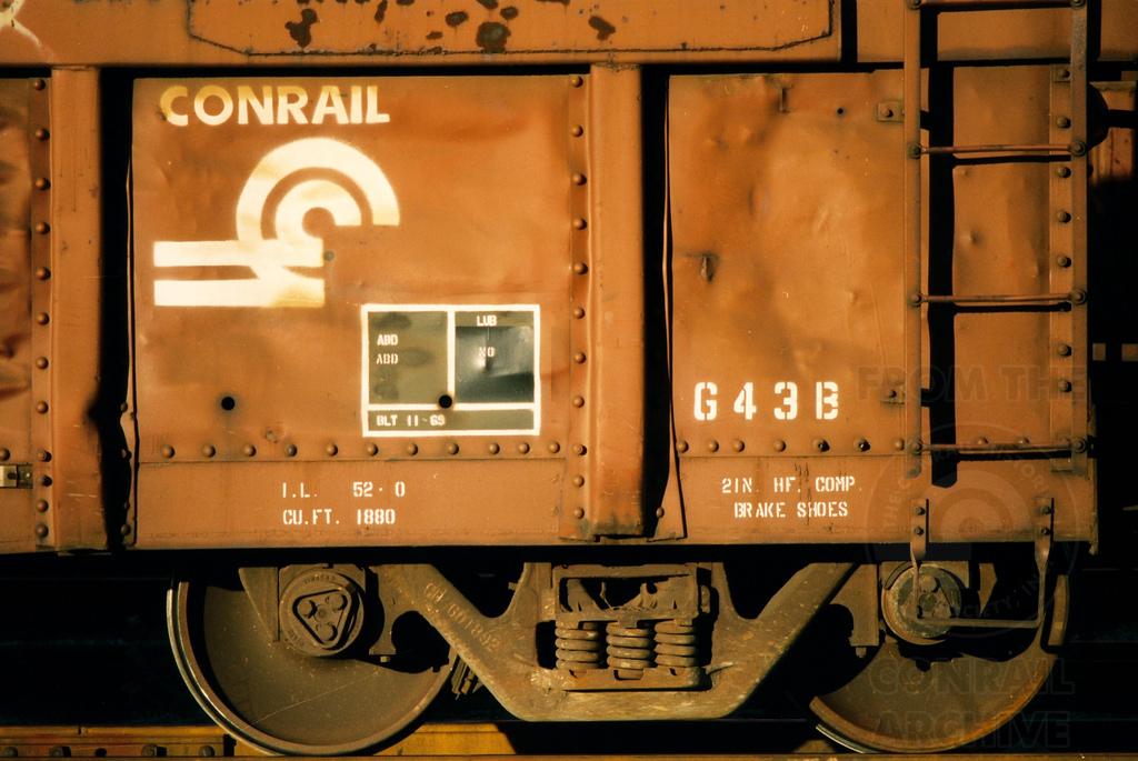 Doug took this shot because he liked the way the low light caught the side of this loaded Conrail gon in Colehour Yard, in September 1998. Doug Davidson photo with permission