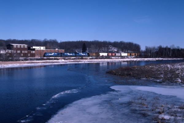 CR 4021/4020 returning to their train after running around it in Springfield, MA. on June 3, 1992. Twin truss bridges in the distance carry the Boston line across the Connecticut River to West Springfield.