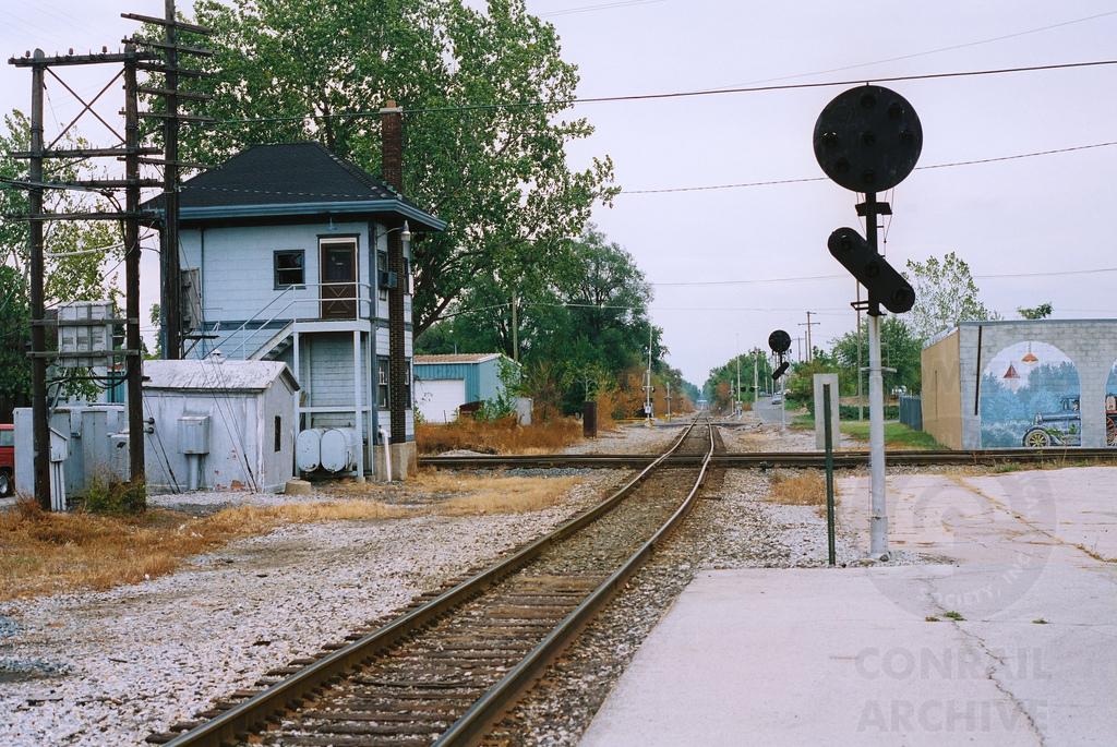 View looking east on the former PRR at Lima, OH. By this date in September 1994, Conrail had reduced the double-track to a single main. NS Tower is at left and position light signals guard the CSX (former B&O) crossing. Doug Davidson photo with permission