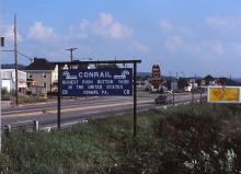 Conrail's sign proclaiming Conway as the "Busiest Push Button Yard In The United States", is seen in this Sept 1, 1980 view.