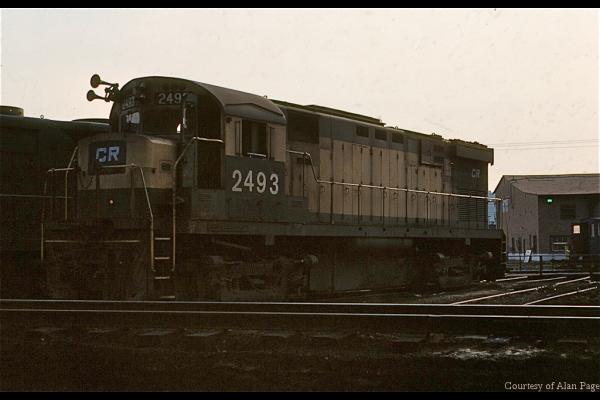 An overview of Conway yard in August, 1977 shows a yard office and the two yard towers in the distance. In the foreground, a six unit engine move makes it's way toward the engine terminal.