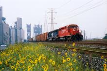 A Soo Line train heads east on Conrail's Chicago Line at the Calumet River Bridge, in September 1997. CP SD40-2 No. 5819 and I&M Rail Link(IMRL) SD45 No. 370 are on the point. Doug Davidson photo with permission