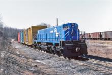 CR 1124, an MT6 slug rebuilt from PRR 8656, is seen coupled to a cut of cars near "BEAVER" at Rutherford, PA on 3/8/1986.
