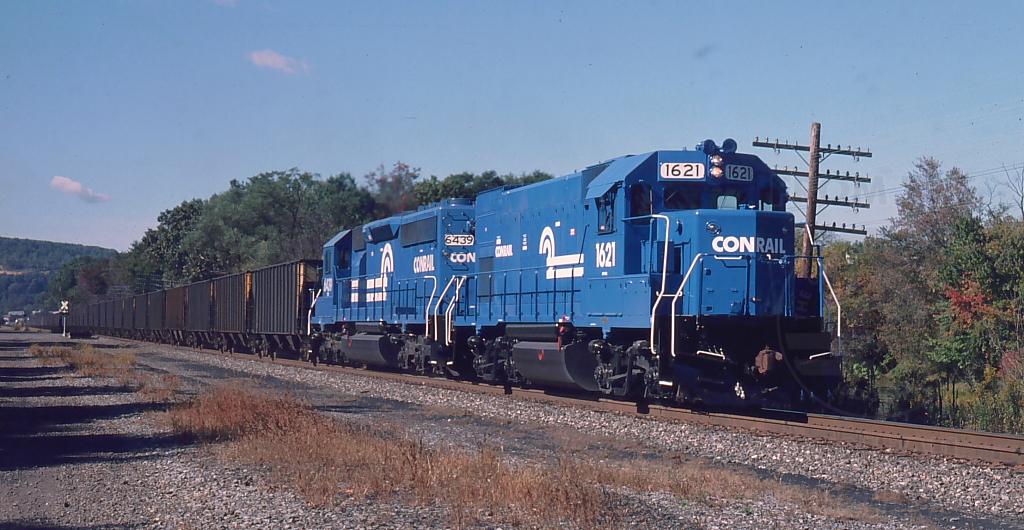 Way out of place GP15-1 1621 leads SD40-2 6439 on an empty UFY hopper train at Montgomery, PA on 10/5/89. Train originated in York Haven, PA and was heading to Clearfield, PA to be forwarded back to the mines for reloading. I hope the air was good in this train. The 1621 lacked dynamic brakes so the air would have had to have been used for all slow downs and stops.. 1621 would spend many years in Lancaster, PA and along Amtraks lines in the eastern part of the Conrail system..