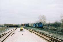 Conrail GP15-1 No. 1667 has a westbound local freight in tow in this view from the CTA station at 49th Street and Western Avenue. This operation is a surviving vestiage of the former Chicago River and Indiana, and on this March 1995 date, was headed for the industrial district beyond Corwith Yard. Doug Davidson photo with permission