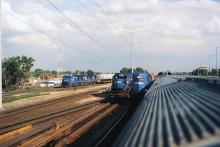In a view from a dome car on Amtrak Train No. 30, the Capitol Limited, Conrail power congregates at Park Manor (67th Street) at the east end of Englewood Yard in August 1991. Engines that can be identified in this shot include the 1672, 1696, and 5004. Doug Davidson photo with permission