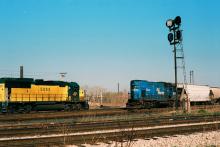 A set of C&NW light power led by GP50 No. 5053 is seen heading east on the CJ, meeting a Conrail GP15 No.1678 working the west end of Ashland Avenue Yard. The old hump signal still stood in April 1988. Doug Davidson photo with permission
