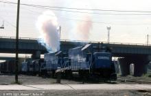 Almost new Conrail GP-15's #'s 1687 & 1686 accelerate with a cut of cars at Croxton yard in Secacus, N.J. September 17, 1979.