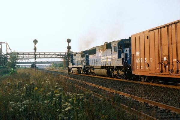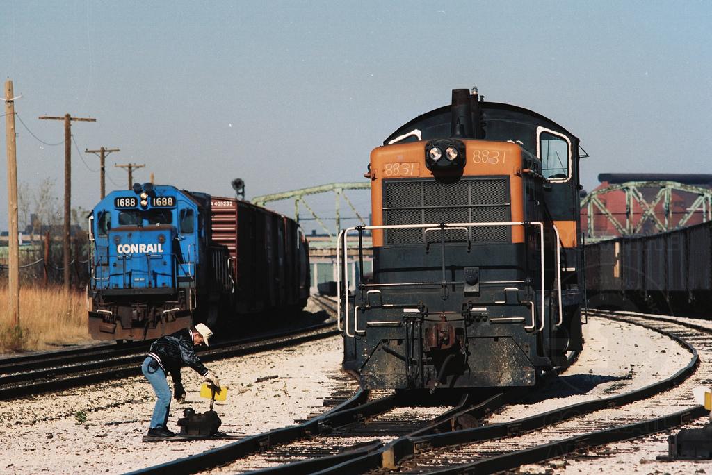 A Conrail local freight behind GP 15 No. 1688 passes by on the IHB's Kanakee Line, while IHB NW2 No. 8831 works Michigan Avenue Yard in October 1990. Doug Davidson photo with permission