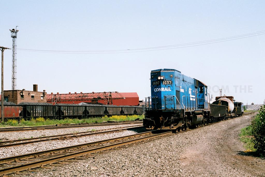 A Conrail hot metal train with just one bottle car behind GP15-1 No. 1697, has departed Acme Steel on Conrail's River Branch, heading for Riverdale, in June 1992. Note the black Chicago Shortline hoppers(CSL) in the background. Doug Davidson photo with permission