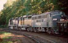 CR SD-35 6038 leads leased CNW GP-30 818 and F-7A 1729 as they roll off Rockville Bridge toward Enola yard in June, 1977.