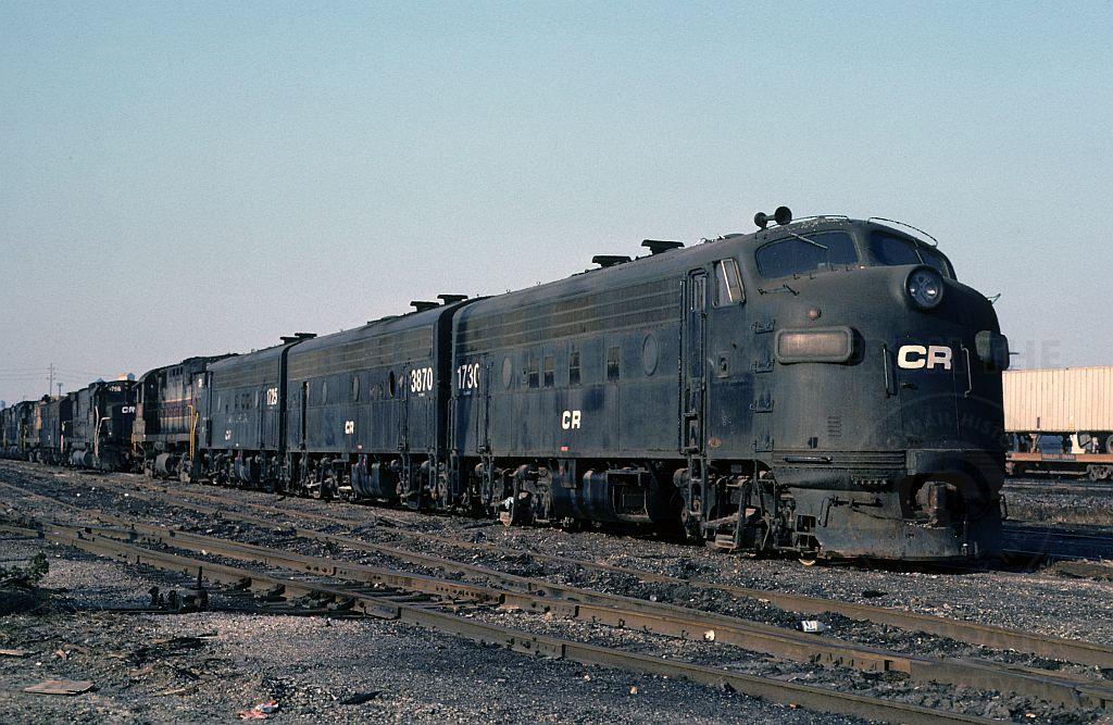 What a place to find a nice ABA set of Conrail F's, the Collinwood deadline. Their running days over, the 1730. 3870, and 1725 have joined former EL, RDG, and PC Alco's to await a trip to the scrapper this November 1978 day.