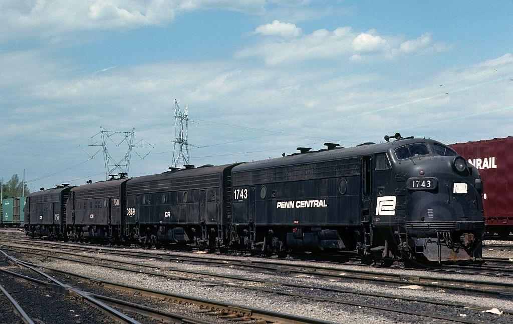 A Conrail ABAA set of F7's rest at Motor yard on the east side of Cleveland,Ohio after their run from Collinwood. It's May of 1977, and all but the 1743 have received the "CR" treatment. In order, 1743,3869,1750,and 1755.