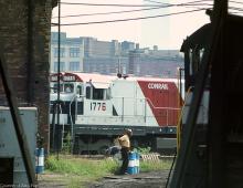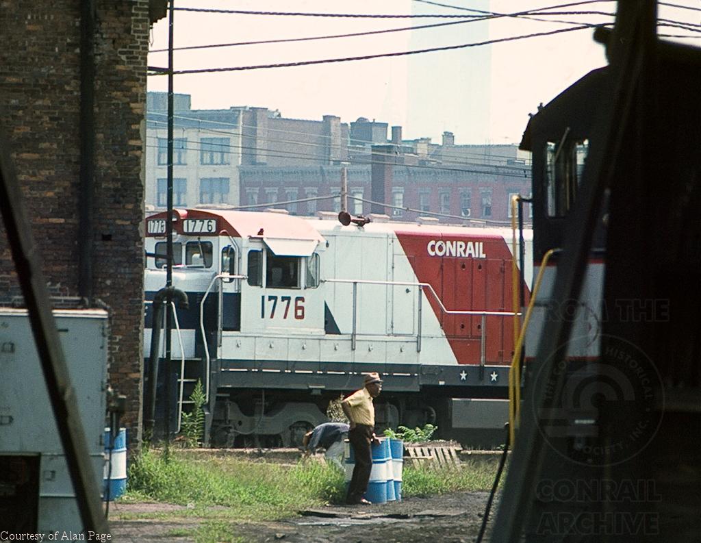 With Comet I cars behind, Conrail 1776 (ex-EL 3351) waits for assignment at Hoboken in August, 1977.
