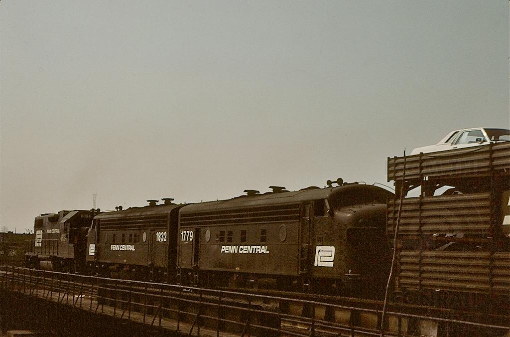 PC GP38-2 8094 leads former NYC F-units 1832 and 1779 as they rush autoracks through Binghamton, NY in April, 1977.