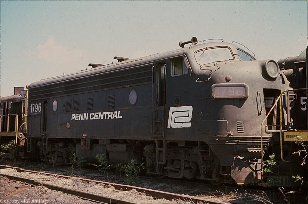 Former NYC/PC F-7A 1796 rests retired in the Juniata shops deadline in August, 1977.