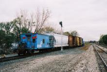 Conrail class N6A transfer caboose 18043 brings up the rear of a local freight on the former PRR Panhandle Line at Brighton Park, IL in November 1998. Doug Davidson photo with permission
