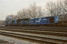 Previous Next Photo By Alan Page CR C36-7 6639 leads GP-40 3053 and B23-7 1933 through Allentown yard in December, 1988. Year 1988 Original Date 12/1/88 Location Allentown PA Equipment Type GE B23-7 Conrail Number 1933 Collection CRHS Conrail Photo Archive Contributions