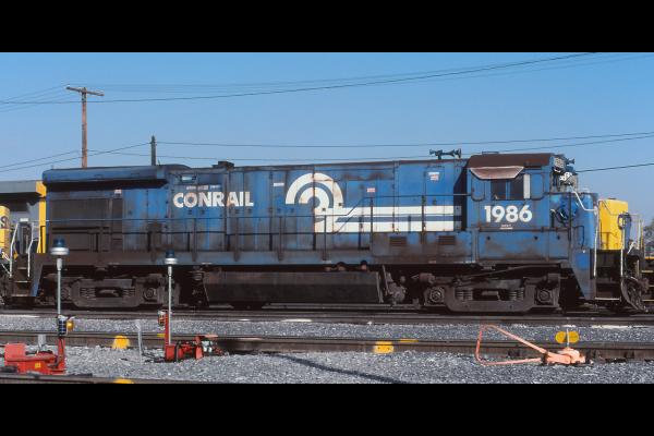 A Conrail Track Geometry Train behind B23-7 No. 1933 is tied up near the main line fueling racks at Elkhart, IN, in June 1993. Doug Davidson photo with permission