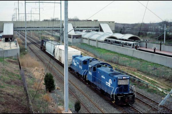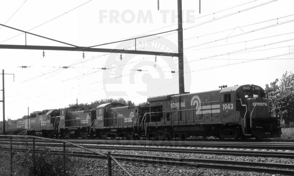 Previous Next Photo By Michael DeSoi Sr. Conrail 1943, 9413, 9592, 7677 (B23-7, SW1001, SW1500, GP38) on a lite power move near Holmesburg Junction on Philadelphia, PA. July 7, 1985 Year 1969 Original Date 12/31/69 Equipment Type EMD SW1001 GE B23-7 Conrail Number 1943 9413 Additional Galleries Michael DeSoi's Primarily Philadelphia Area Conrail Photos Line or Locale Conrail on the Northeast Corridor Conrail in and Around Philadelphia Collection CRHS Conrail Photo Archive Contributions