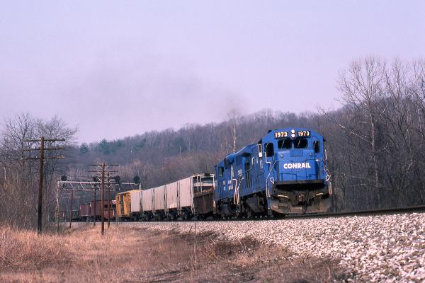 A mix of B23-7s and SD80MACs, both common power on the old B&A, rest in the yard at West Springfield, MA.