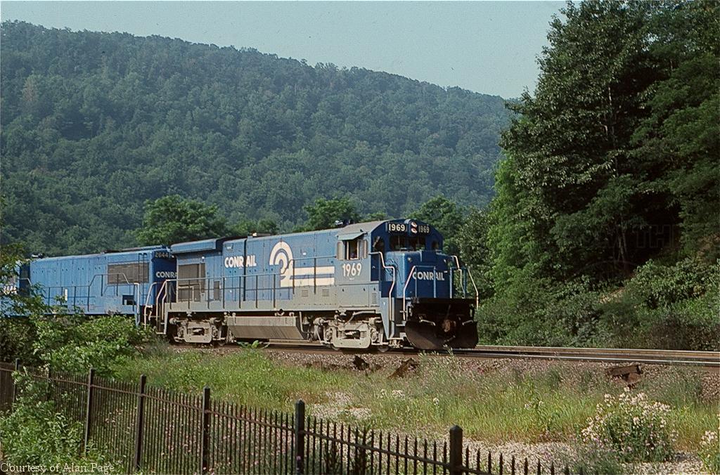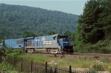 CR B23-7 1956 leads U25B 2644 and B23-7 1969 with mixed freight down Horseshoe in August, 1979.